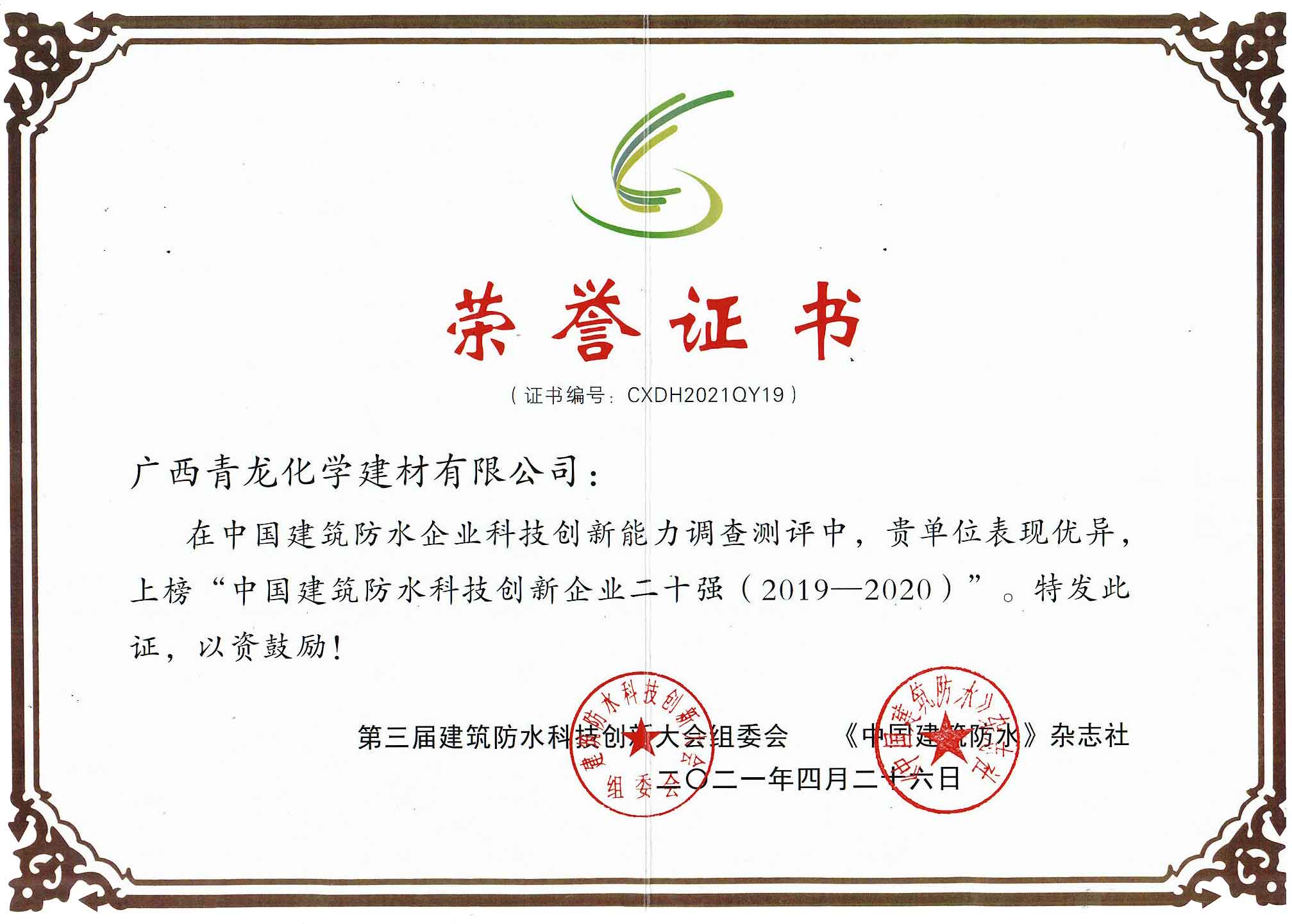 中國(guó)建筑防水科技創(chuàng)新企業(yè)二十強(qiáng)(2019-2020)