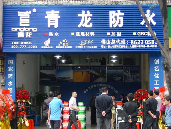 5月4日,伴隨著喜慶的民樂,熱鬧的鑼鼓,位于佛山市南海區(qū)桂城東二大道南興裝飾城一樓A8商鋪的青龍防水佛山總代理專賣店隆重開業(yè)。經(jīng)過精心的裝修,藍(lán)底白字的“青龍防水”門牌顯得格外顯眼,而店前的花籃也為開業(yè)慶典增添了節(jié)日的氣氛。青龍建材集團(tuán)董事長宋敦清、廣東省區(qū)域服務(wù)人員,以及一百多位防水業(yè)界嘉賓到場祝賀。