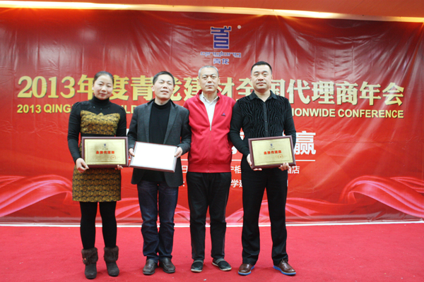 青龍集團(tuán)董事長(zhǎng)宋敦清先生與獲 得2013年度金牌代理商合影(左一為許明妹女士)