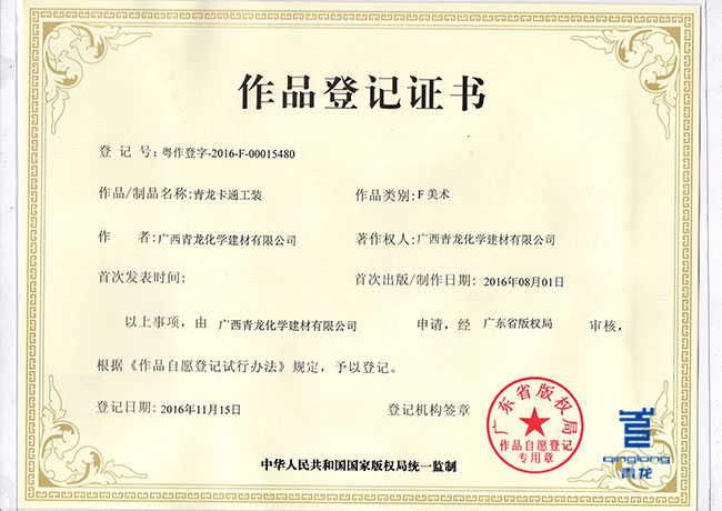 該證書的獲得,是青龍公司在知識(shí)版權(quán)工作上的又一個(gè)里程碑,它意味著青龍公司在具有獨(dú)立知識(shí)版權(quán)的防水行業(yè)得到了國家權(quán)威的認(rèn)可和充分的肯定。