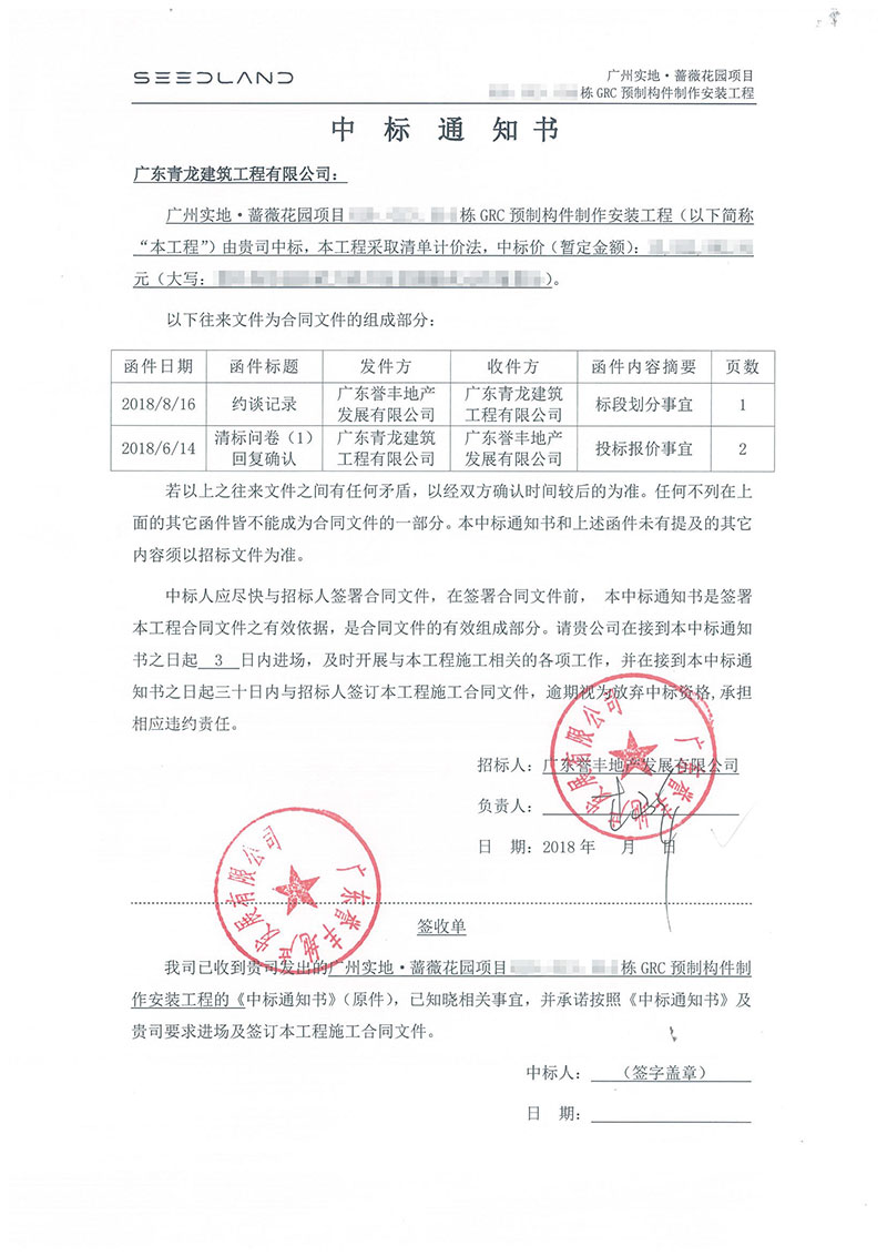 近日,廣東的青龍公司憑借強(qiáng)大的實(shí)力,成功中標(biāo)了廣州實(shí)地薔薇花園項(xiàng)目GRC預(yù)制構(gòu)件制作安裝工程,這是繼深圳坪山會(huì)展中心之后,青龍公司近期又承接的又一個(gè)千萬(wàn)級(jí)GRC大單,彰顯了青龍雄厚的GRC技術(shù)實(shí)力。
