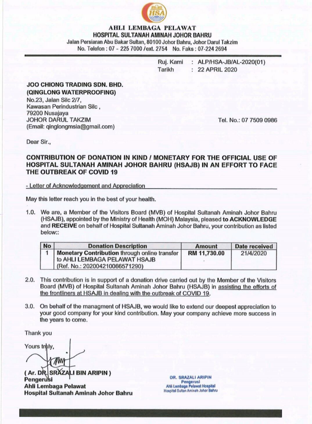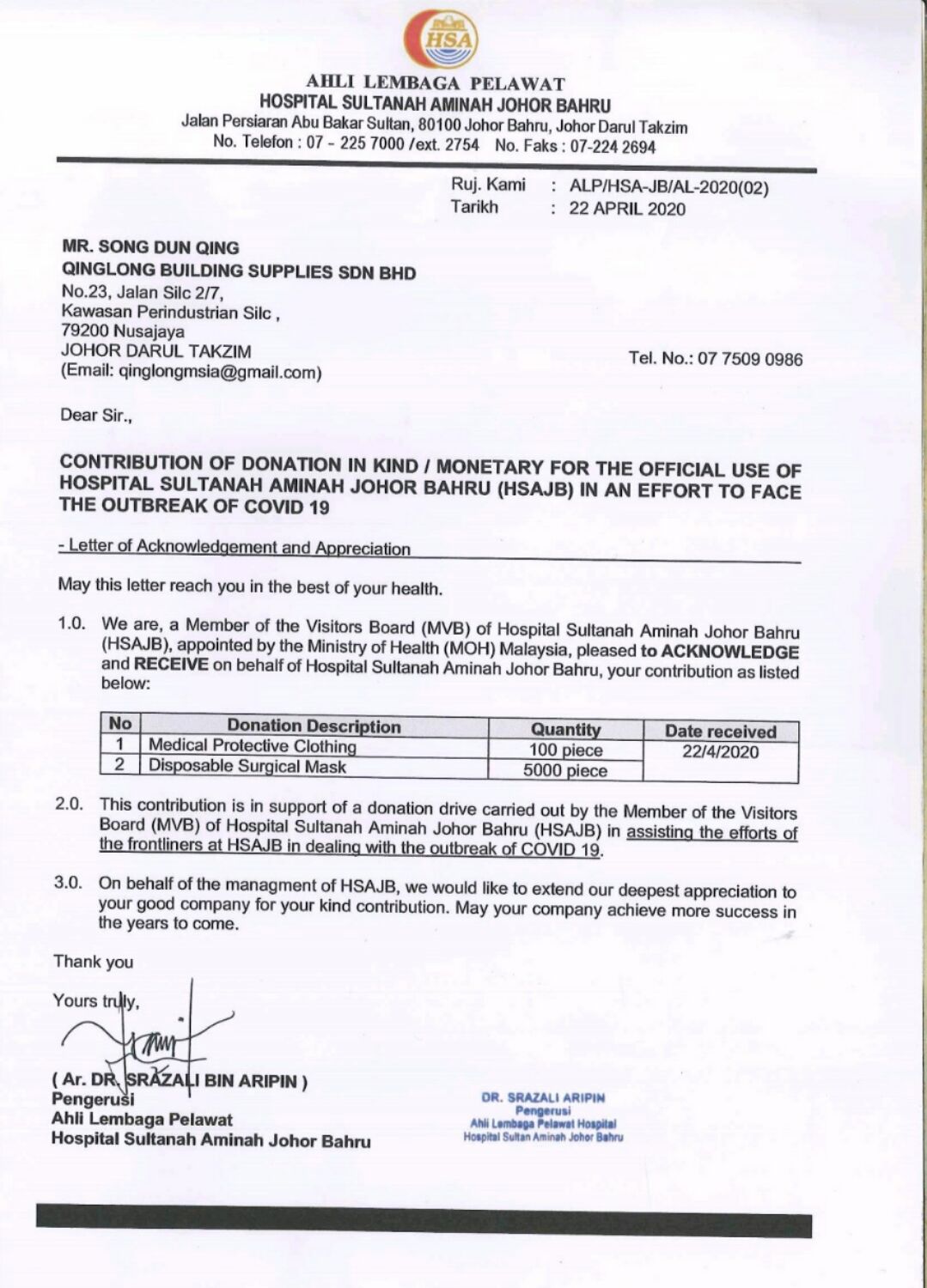 近日,馬來(lái)西亞Hospital Sultanah Aminah柔佛州新山醫(yī)院在收到物資后,致函表示了真誠(chéng)的感謝,感謝青龍公司和廣大客戶的仁義之舉。