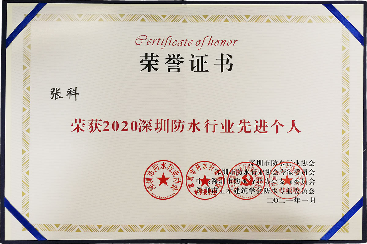 2021年1月9日,在深圳防水行業(yè)2020工作總結(jié)大會暨一屆五次會員大會(以線上視頻和線下會議方式召開)上,青龍防水補漏質(zhì)量總監(jiān)張科榮獲"2020深圳防水行業(yè)先進個人"稱號。