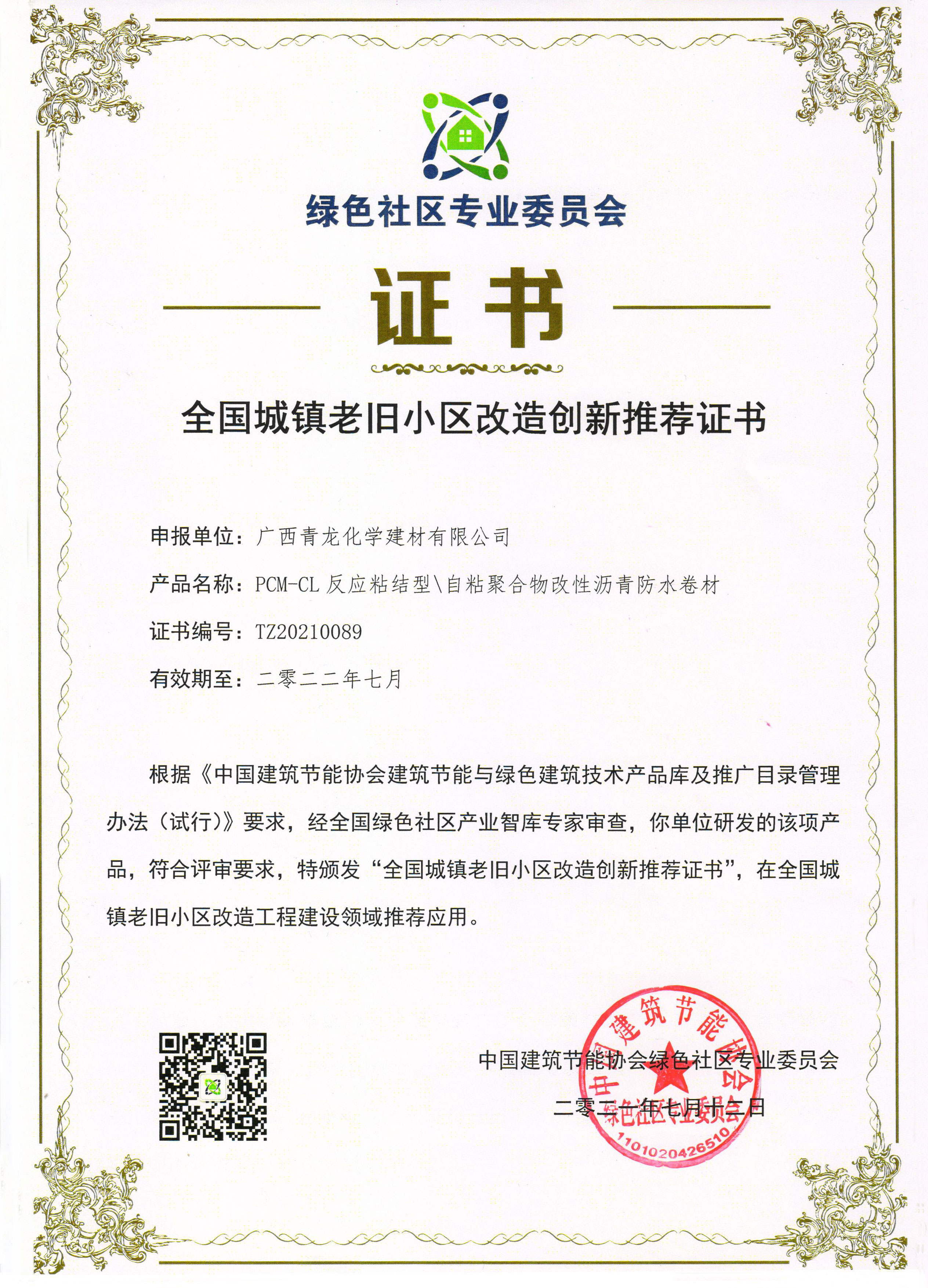 近日,由中國建筑節(jié)能協(xié)會(huì)綠色社區(qū)專業(yè)委員會(huì)主辦,全國城鎮(zhèn)老舊小區(qū)改造創(chuàng)新推薦產(chǎn)品、技術(shù)申報(bào)企業(yè)材料評(píng)審會(huì)圓滿結(jié)束,在公開、公平、公正的原則下,青龍公司自主研發(fā)生產(chǎn)的PCM-CL反應(yīng)粘結(jié)型自粘聚合物改性瀝青防水卷材成功入選全國城鎮(zhèn)老舊小區(qū)改造創(chuàng)新產(chǎn)品推薦名單。
