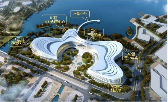 柳東新區(qū)文化廣場(chǎng)項(xiàng)目工程,位于柳州市柳東新區(qū)園區(qū)總部大樓南側(cè),南鄰龍湖,西靠縱十二路,北臨橫三路,建設(shè)用地南北向190m,東西向400m。廣場(chǎng)以"蝶舞"作為設(shè)計(jì)思路(見圖1),展示出百花齊放與蝶舞翩翩的建筑外型,傳遞"文藝普惠,民智為計(jì)"的指導(dǎo)思想。