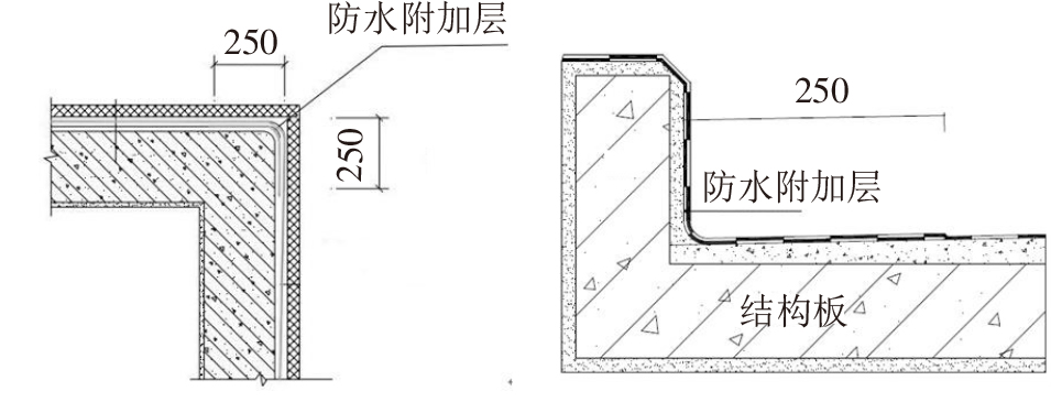 在基面陰陽角兩側(cè)做好防水附加層,其總寬度為500mm左右。平立面連接處的陰陽角需抹成圓角形狀,其中陽角半徑大于20mm,陰角半徑大于50mm(圖6)。