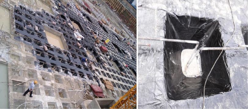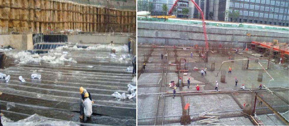 2、預(yù)鋪反粘 ——將附有高分子自粘膠膜層的防水卷材空鋪在基面上,然后澆筑結(jié)構(gòu)混凝土,使混凝土漿料與卷材自粘膠膜層緊密結(jié)合的施工方法。