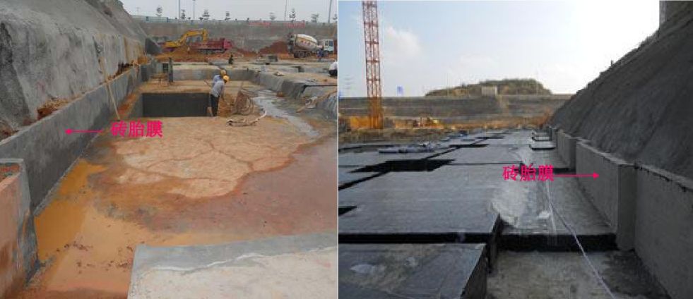 2、磚胎膜(亦稱臨時擋土墻):磚胎模一般用于地下室底板側(cè)壁,由于是外防水,須在墊層上做防水,且防水要延伸到磚胎膜上,以便以后澆注完混凝土后,防水能上翻到側(cè)壁混凝土上,如果底板側(cè)壁用模板的話,無法做防水,所以采用了用磚做模板的辦法。另外在一些澆完混凝土后模板無法拆除或者拆除難度很大的地方也有采用磚來代替一 般模板的辦法。