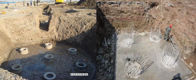 6、樁基礎(chǔ):樁基礎(chǔ)由樁基和連接于裝頂?shù)某信_共同組成,是用承臺把沉入土中的若干個單樁的頂部聯(lián)系起來的一種基礎(chǔ)。樁的作用是將上部建筑物的荷載傳遞到深處承載力較大的土層上,或?qū)④浫跬翆訑D密以提高地基上的承載力及密實度。