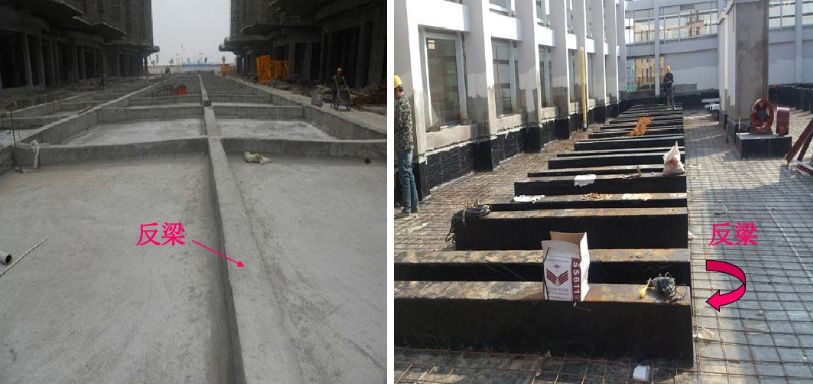 10、反梁:反梁只是一種需要,是因為某些原因(如層高不夠、梁底面需要平整,而梁上部又可上翻等),而把梁高的一部分作到樓板的上方(一般的梁都是與樓板平的)或者是筏板基礎(chǔ)上表面需要平整而把梁做到板的下面。