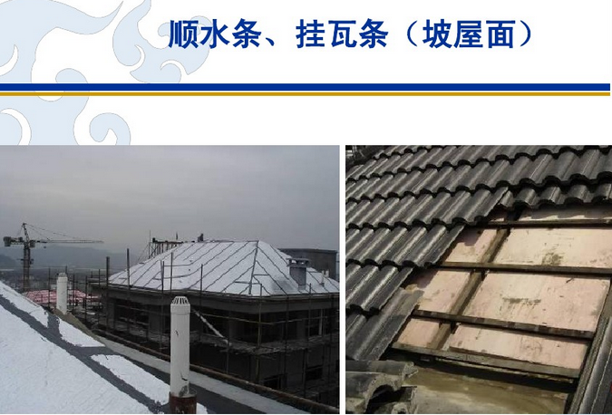 16、順?biāo)畻l:瓦下沿豎直方向設(shè)置的屋面構(gòu)件。處于掛瓦條下,防水層上。主要作用是架空掛瓦條。掛瓦條作用是將屋頂表面的瓦片固定在相應(yīng)位置。搭配使用合適的順?biāo)畻l可以使得屋頂?shù)呐潘Ч屯L(fēng)效果顯著增強,有利于保持夏季的涼爽和冬季的溫暖。