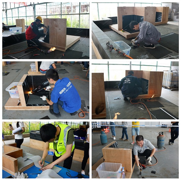 本次比賽,參賽選手同場(chǎng)競技改性瀝青防水卷材、高分子防水卷材施工兩大項(xiàng)目,理論考試現(xiàn)場(chǎng),選手們沉著冷靜地完成作答;實(shí)操比賽中,參賽選手嚴(yán)肅認(rèn)真地按照標(biāo)準(zhǔn)化施工模式進(jìn)行了實(shí)際操作和規(guī)范處理。