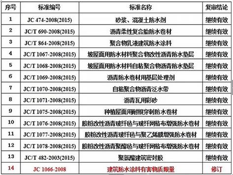 建筑防水行業(yè)中,《砂漿、混凝土防水劑》(JC 474-2008)等13項標準繼續(xù)有效,《建筑防水涂料有害物質限量》(JC 1066-2008)1項標準予以修訂。詳情如下: