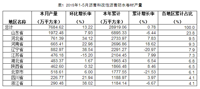 為進(jìn)一步了解我國瀝青和改性瀝青防水卷材產(chǎn)量,國家統(tǒng)計(jì)局對產(chǎn)量較大的176家防水企業(yè)進(jìn)行統(tǒng)計(jì),1-5月,瀝青和改性瀝青防水卷材產(chǎn)量為28919.06萬平方米,同比增長0.78%;其中山東地區(qū)產(chǎn)量較大,為6895.33萬平方米,同比下降6.44%,占全國累計(jì)產(chǎn)量的23.8%。