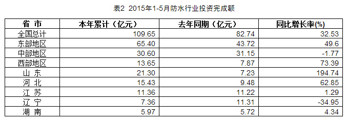國家統(tǒng)計(jì)局對主營業(yè)務(wù)收入高于2000萬元企業(yè)進(jìn)行統(tǒng)計(jì),1-5月,防水行業(yè)投資完成額109.65億元,同比增長32.53%。其中,山東地區(qū)的投資完成額為21.30億元,同比增長194.74%。