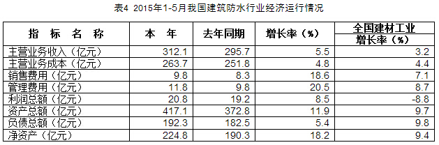 對全國491家主營業(yè)務(wù)收入在2000萬元以上的企業(yè)進(jìn)行統(tǒng)計(jì),資料顯示,1-5月,防水行業(yè)企業(yè)累計(jì)主營業(yè)務(wù)收入312.1億元,同比增長5.5%,增幅高于全國建材工業(yè)2.3個(gè)百分點(diǎn)。主營業(yè)務(wù)成本增幅略高于全國建材工業(yè)。利潤總額為20.8億元,同比增長8.5%,全國建材工業(yè)利潤總額負(fù)增長,同比下降8.8%。